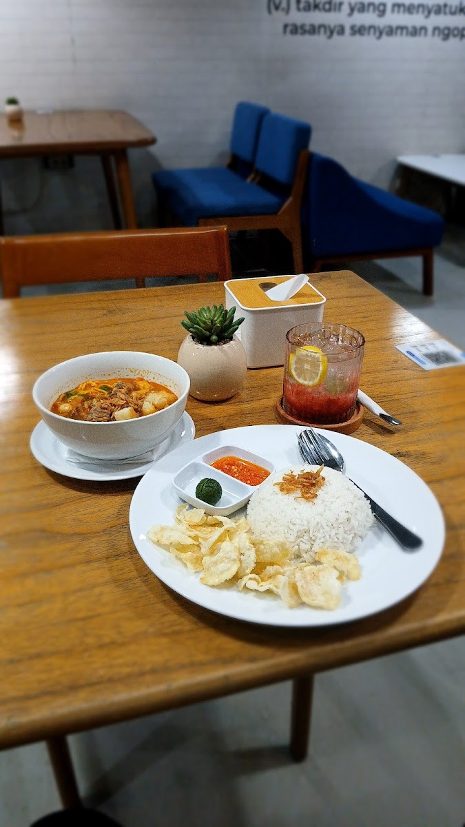 A recommended place to have a meeting, work, group study, or hang out. With two storey floors the first floor is for dining area and the second floor divided into several room for meetings and group study (they can provide projector, sound system, etc) by booking first. The place was inside business complex of yasmin area so no worries for parking area (5k/hour). I personally fond for the use of stainless straws in their cold beverages. They have coffee and non coffee drinks like tea, juice, and mojito (soda-based drink). Light bites and heavy meals are vary with price starts at 30k for snacks and around 35k for heavy meals such as Nusantara dishes and pasta/noodles.
